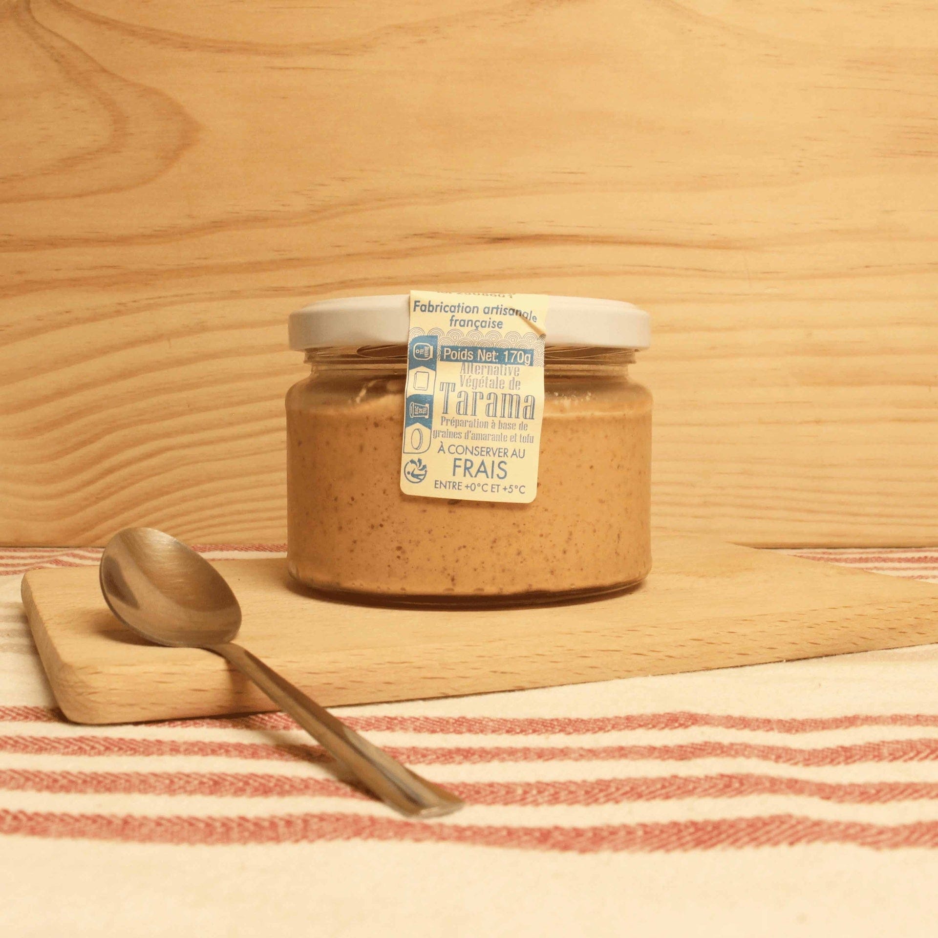 Ce tarama vegan rappelle les œufs de poisson de par son goût iodé dû à l’alliance du tofu fumé et d’algues rouges, et de par la texture granuleuse et croquante des graines d’amarante. Un tour de force végétal fabriquée artisanalement !