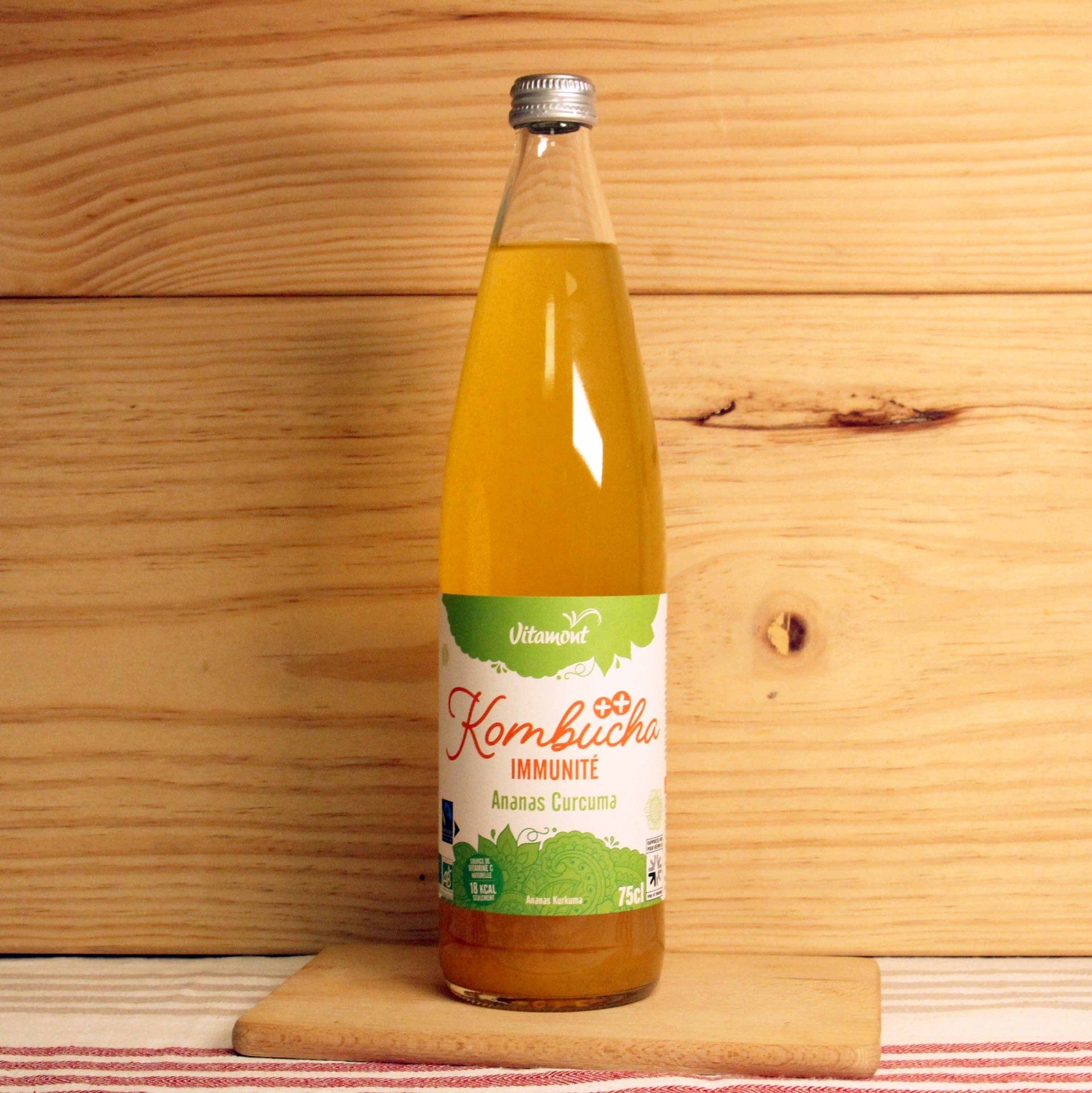 Kombucha* (92,5%) naturellement fermenté et carbonaté [eau filtrée, culture de kombucha*, sucre de canne blond*, thé vert Sencha* (0,029%), thé noir Pu'er* (0,010%)], jus d'ananas* (4,8%), purée d'acérola* (1,8%), purée de curcuma* (0,9%).
