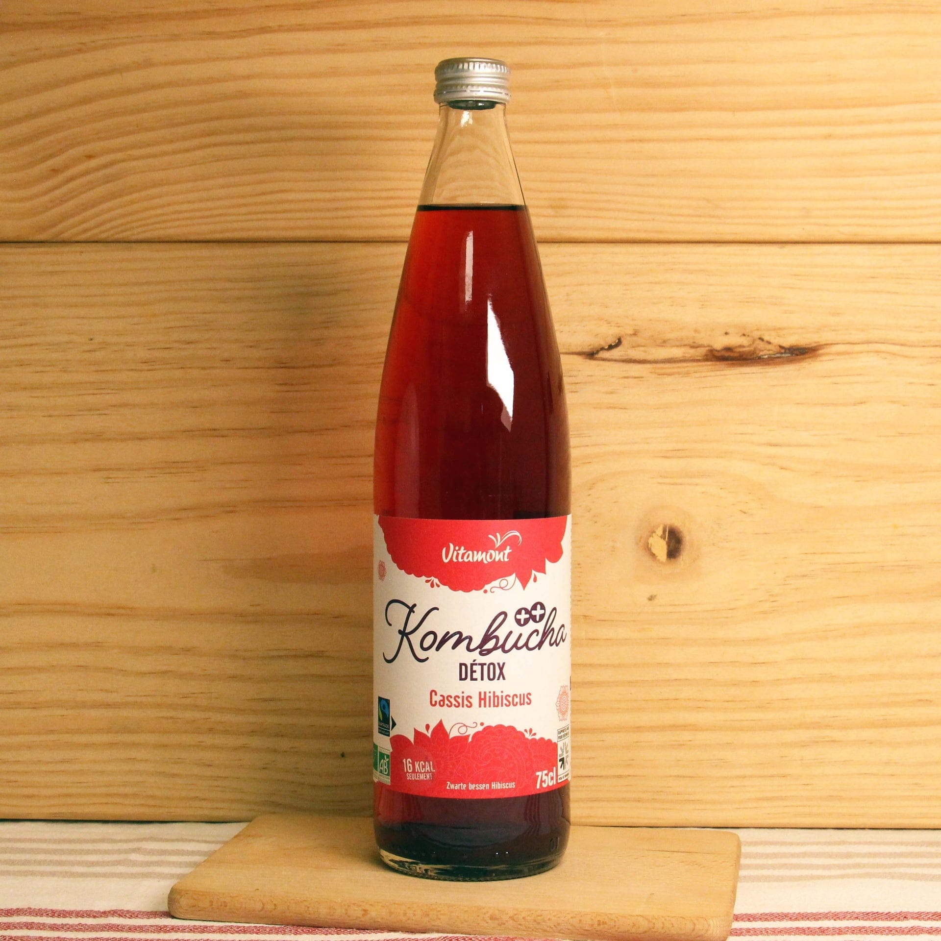 Kombucha* (97%) naturellement fermenté et carbonaté [eau filtrée, culture de kombucha*, sucre de canne blond*, thé vert Sencha* (0,031%), thé noir Pu'er* (0,010%)], jus de cassis* (1,8%), infusion d'hibiscus* (1,2%).