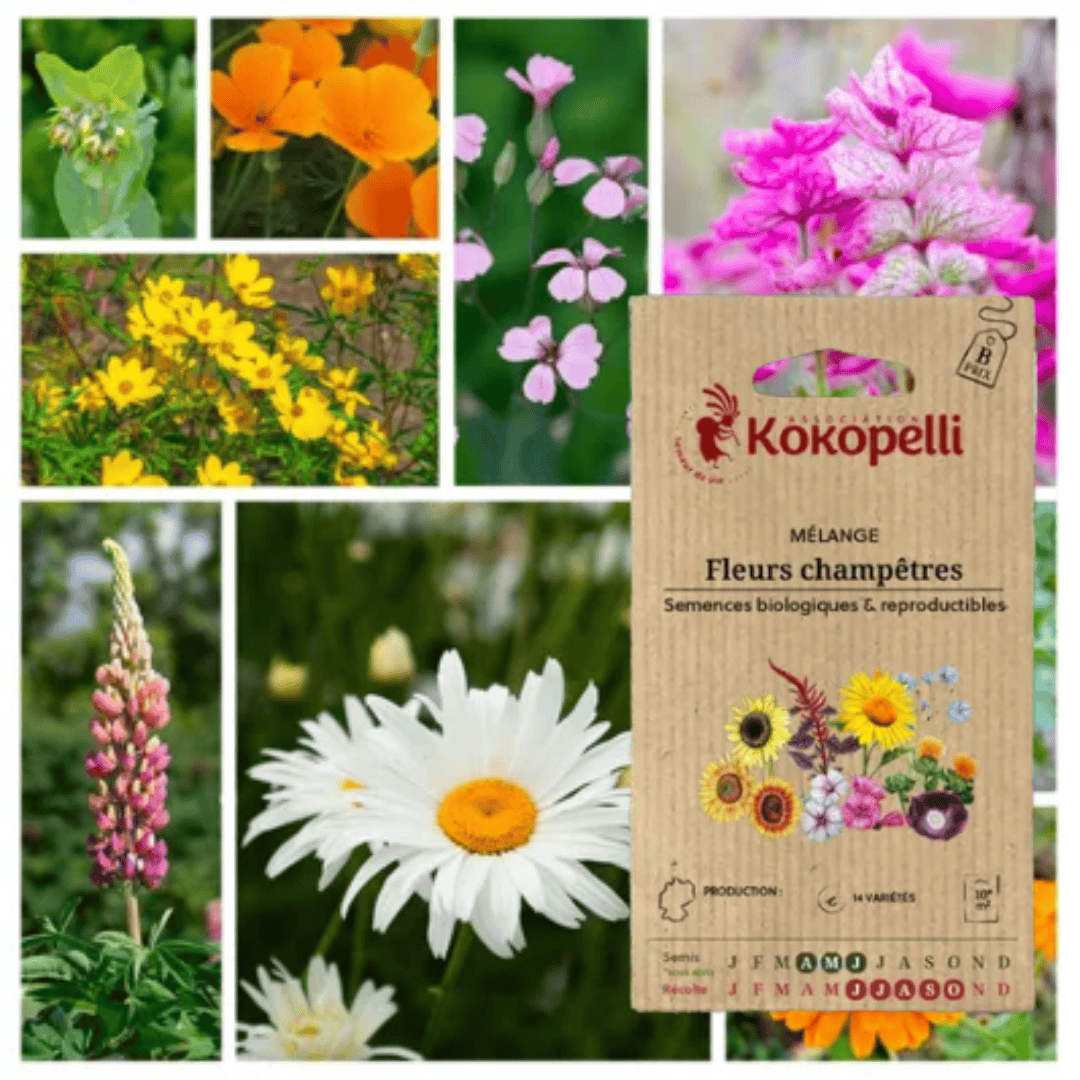 Ce magnifique mélange de charmantes fleurs offre plus d’une dizaine d’espèces et de variétés — lin, pavot, mauve sylvestre, tournesol, aneth, etc. — idéales pour apporter une touche champêtre et bucolique dans tous les jardins.
