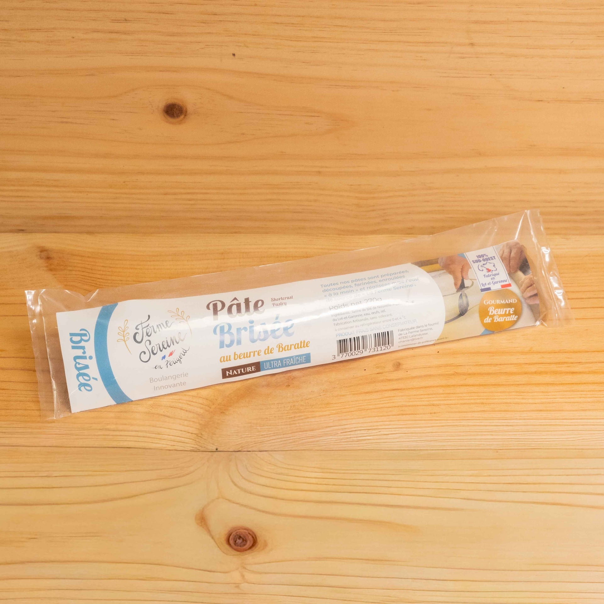 Pâte brisée à dérouler, élaborée en filière courte avec du beurre de baratte de la Fromagerie Baechler (Le Temple sur Lot – 47110), et de la farine de blés, issus en partie de la production de La Ferme Sereine et, pour le reste, récoltés dans la région, moulue par le Moulin Régional Gers Farine. Produit découpé, fariné, roulé « à la main » et emballé sous atmosphère protégée.
