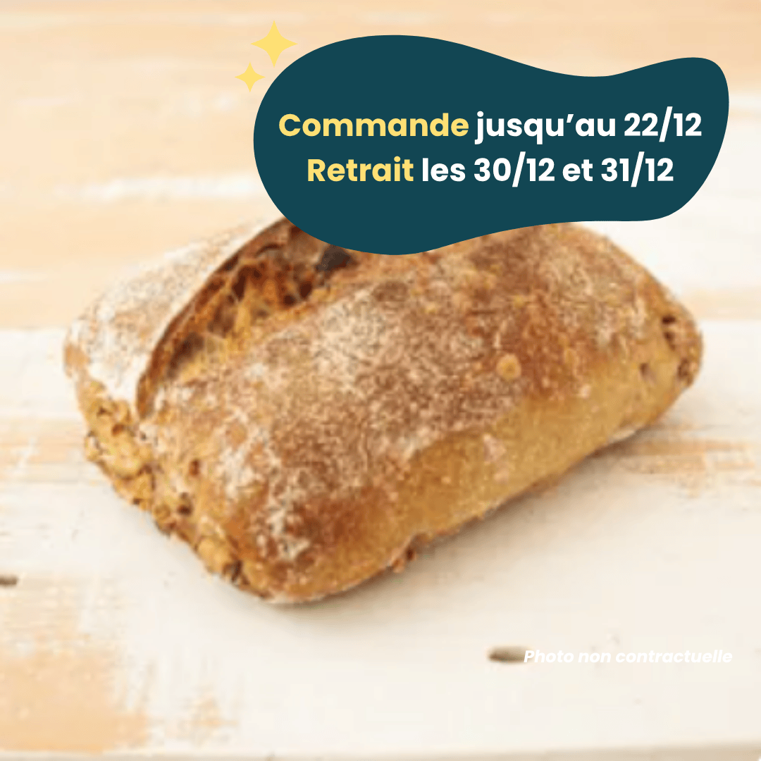 INGRÉDIENTS : Farine (gluten) T65, levure fraîche, noix, sel fin, eau.