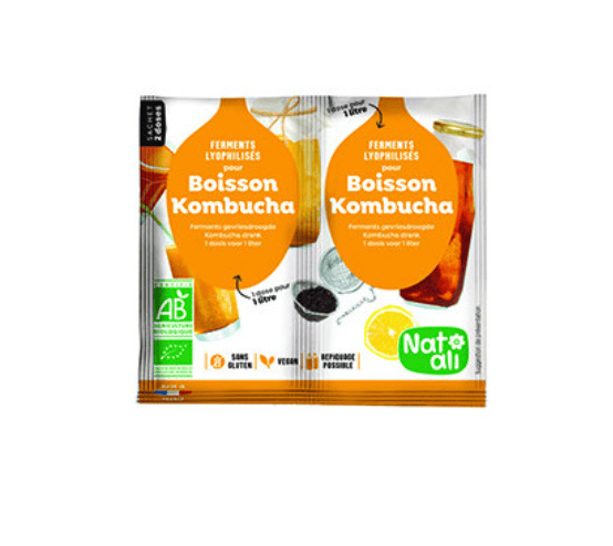 Mode d’emploi : Utiliser des ustensiles parfaitement propres. Préparer 1litre de thé vert ou de thé noir. . Il est préférable d’utiliser un thé nature car l’aromatisation peut altérer le goût. Verser dans un récipient hermétique propre et laisser refroidir. Ajouter 1 dose du ferment pour kombucha et 50g de sucre. Bien fermer le récipient et laisser fermenter 5 à 8 jours à température ambiante (20-25°C).