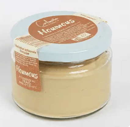 Ce houmous ne contient pas de sésame. Il est remplacé par une purée de graines de tournesol, torréfiées et broyées sur place.